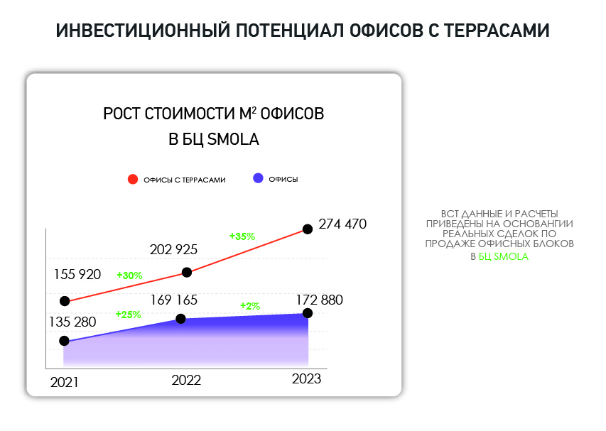 Мы решили проверить эту статистику на примере собственных продаж в В БЦ Smola. Посмотреть результаты наглядно можно на графике. Офисы с террасами растут в цене значительно быстрее.
